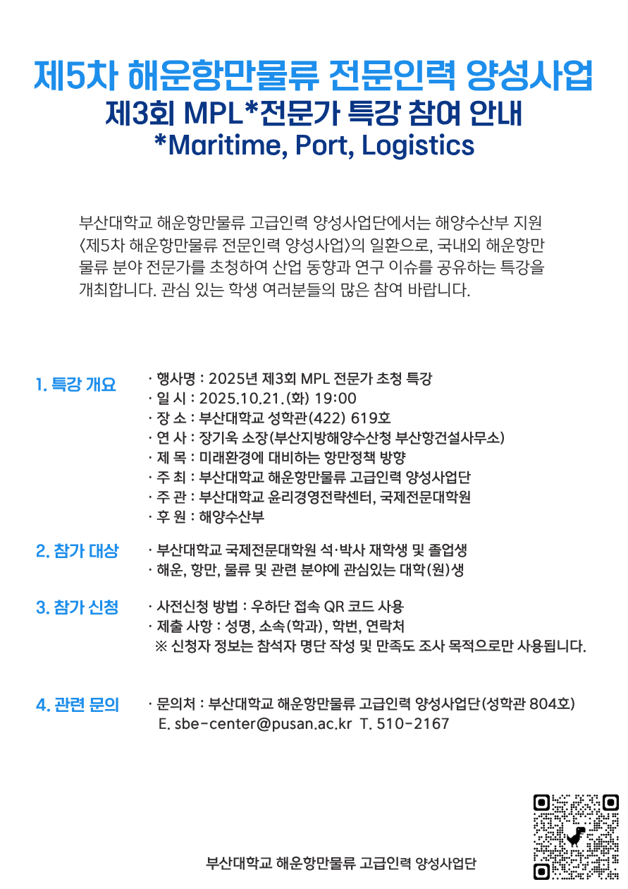ㅇ 문의처 : 부산대학교 해운항만물류 고급인력 양성사업단 (성학관 804호)