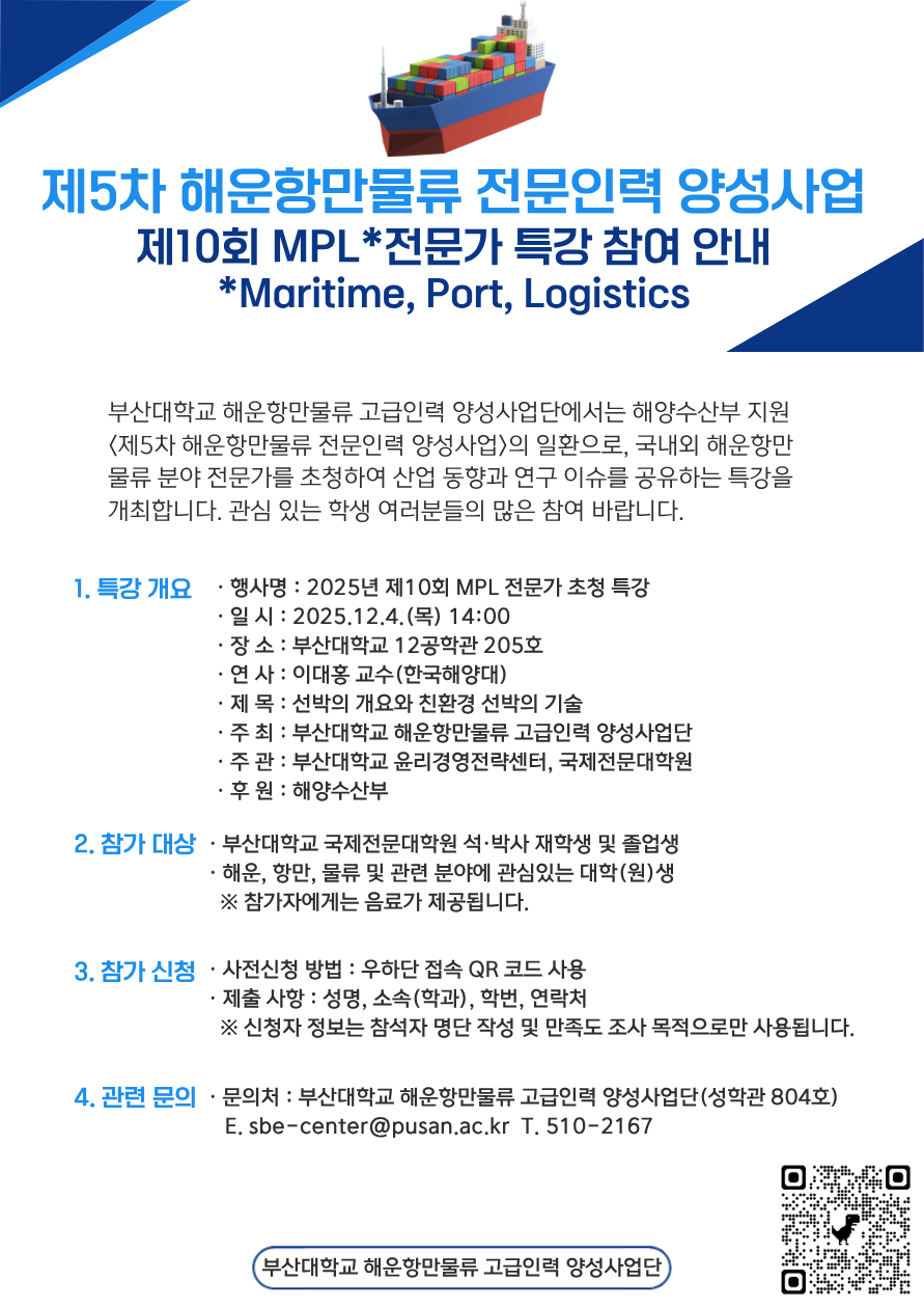 ㅇ 문의처 : 부산대학교 해운항만물류 고급인력 양성사업단 (성학관 804호)
